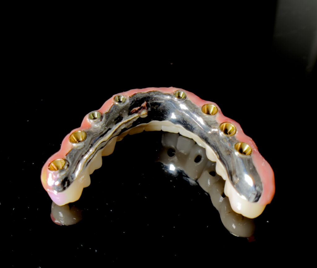 Coronas, puentes y estructuras completas sobre implantes. Fabricación con máxima precisión para garantizar ajuste perfecto y durabilidad a largo plazo.